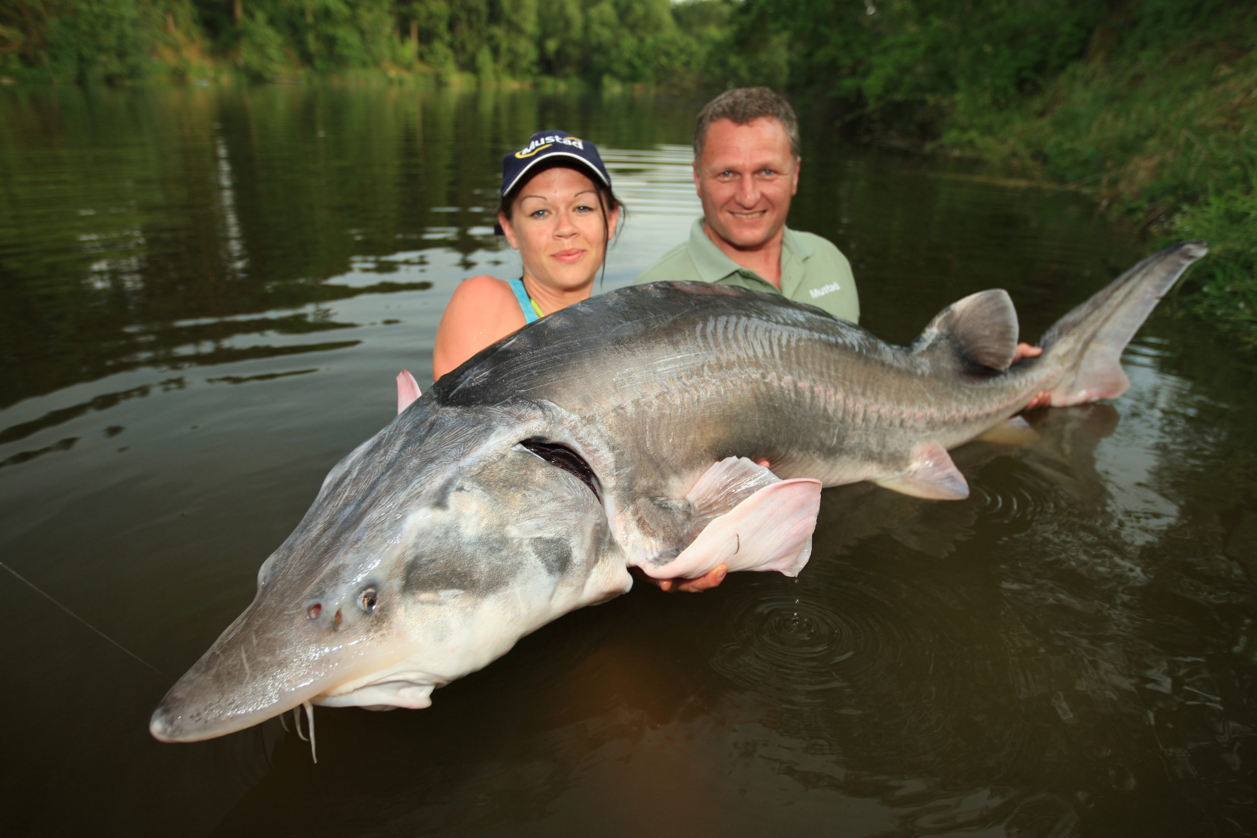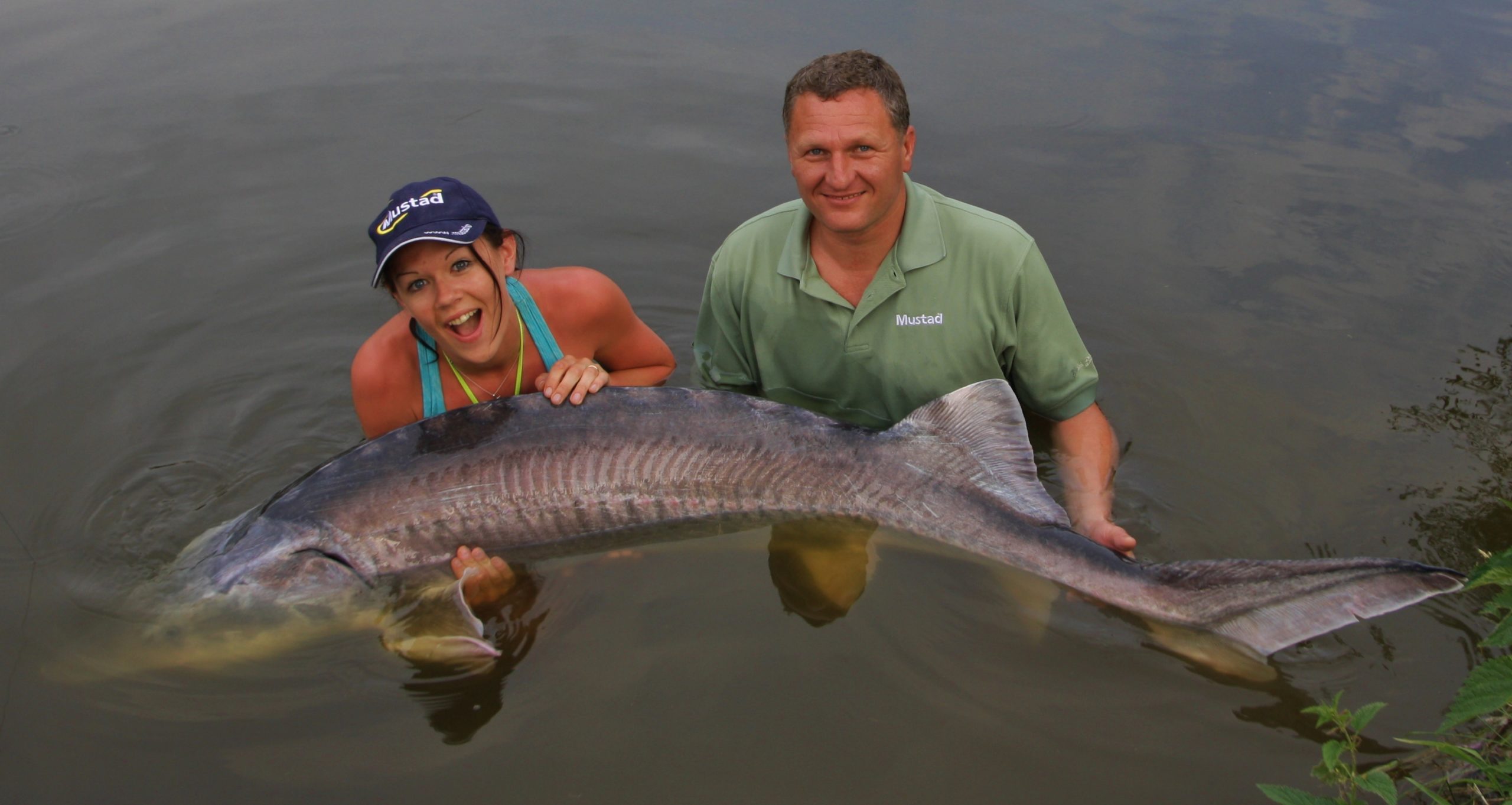 Magnus som kollar på brister ut; ”Emma, det dær ær en stoooor gædda! Var førsiktig med den lætta utrustningen!”. Då bryts ytan av en grå skugga som ær længre æn mig; Det ær ingen gædda, det ær en stor beluga stør!! Jag ser hoppløst ner på mina ultralætta prylar medans støren sakta drar ut meter på meter… Detta ær ju fysiskt omøjligt, min 0,12 mm flætlina kommer att ryka nær som helst! Men jag ger inte upp, utan jag tar det så varsamt jag bara kan. Jakub Vagner kommer ner till bryggan mitt under fighten och tappar næstan hakan nær han ser vad jag håller på med.