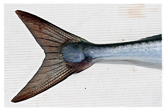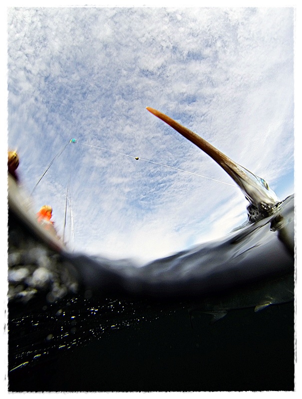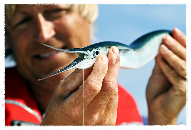 Det tok ikke lange tiden før det var napp, og i motsetning til når andre fisk tar agnet og drar duppen under, begynte duppen nå og «fyke» fra side til side i et voldsomt tempo. Snakk om action, i vilt fart tok duppen først til den ene, og så full fart til den andre siden, så kom plutselig en hale og et spyd opp av vannet, den var kroket! En kan trygt si at den lever opp til navnet «vår lille sverdfisk».