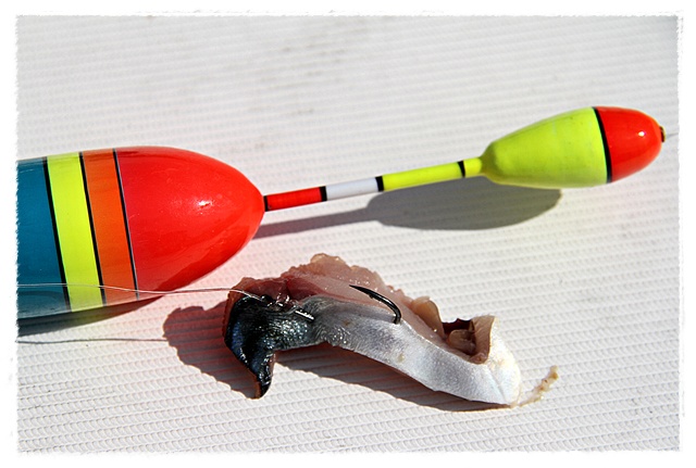 Så snart jeg var på plass, og satt el-motoren (med gps) på standbye, begynte jeg og fore litt med små biter av makrell. Det og hive ut noen små agnbiter som driver med strømmen gjør at horngjelen samler seg i nærheten av båten. Så er det bare og «lempe» ut en stang eller to med dupp og krok, med en makrellbit som agn. Husk å fortsette den ekstra foringen med små agnbiter underveis mens du fisker også.
