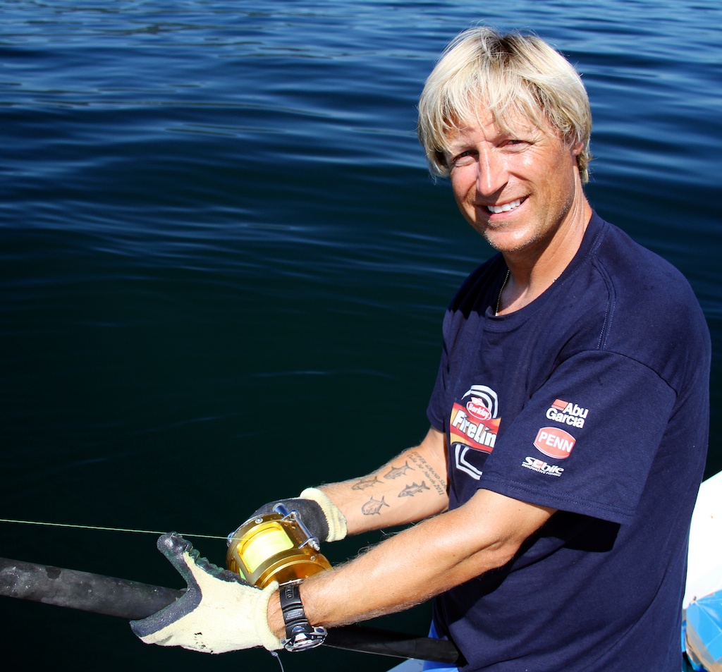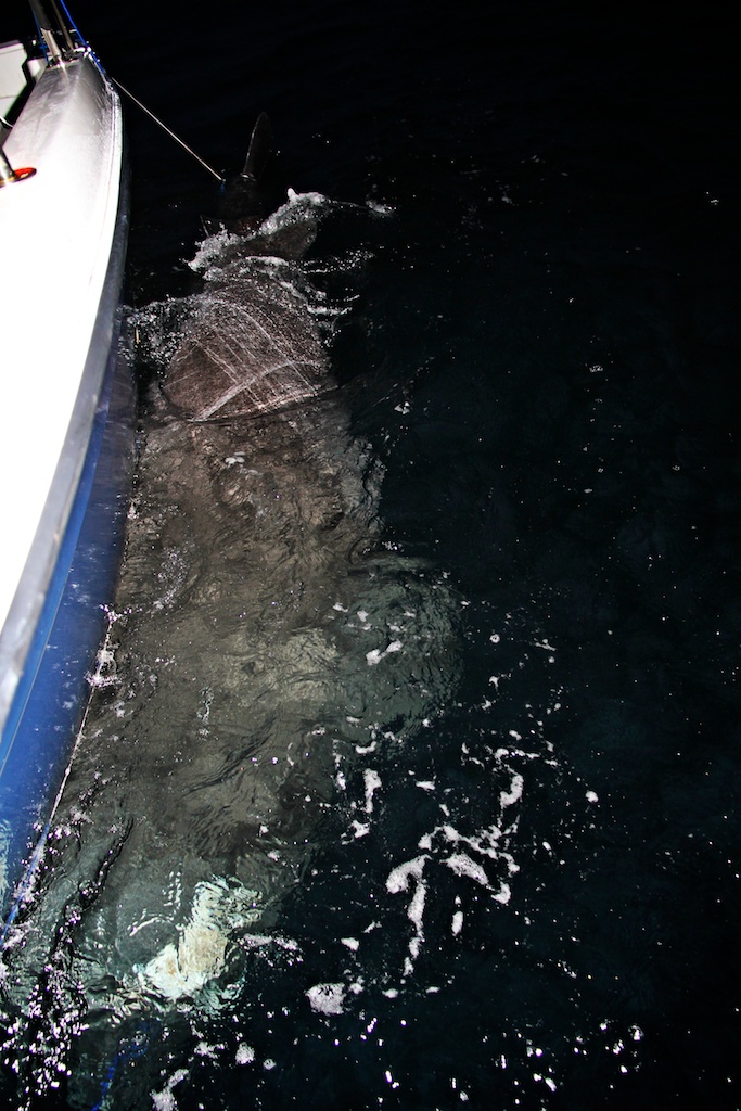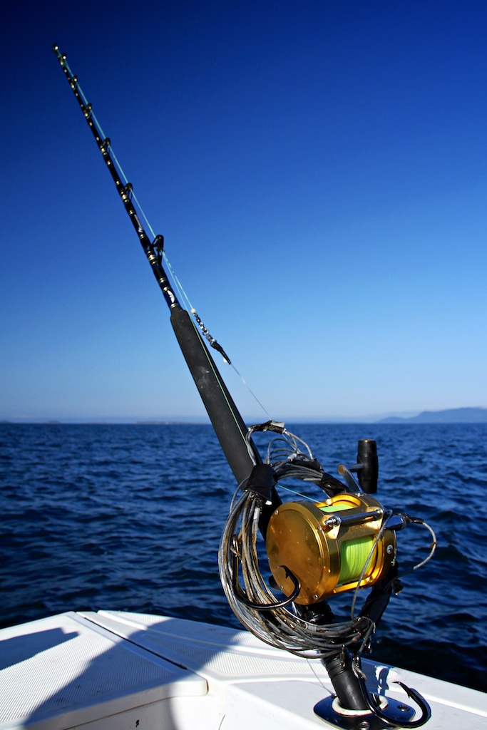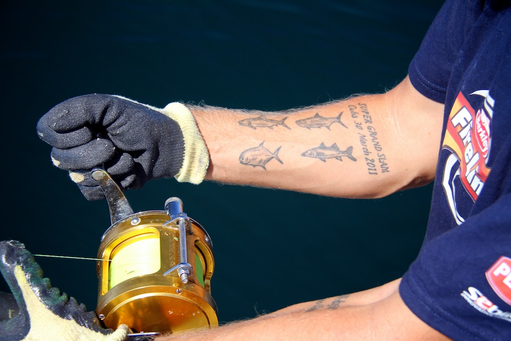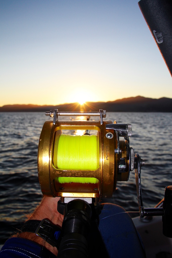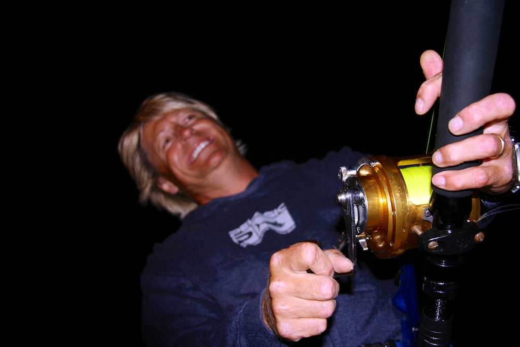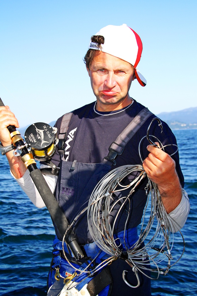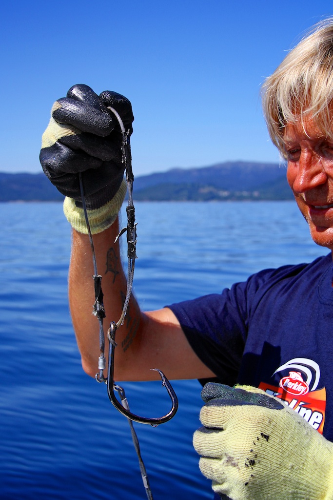 The gear used was a 6 foot Fenwick Stand-up Offshore 60-130 lbs. For reel I picked a Penn International 50S and about 1800 meter Berkley Fireline 0,39mm. The tackle was made by Fredric Kullin, consisting of 3mm steel wire and 2 mm line. Sliding weights on 600 gram to 1,2kg. Two Owner Mutu 16/0 circle hooks presents a bait on the seabed and another a few meters above.