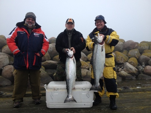 Tidlig fredag morgen er alle 14 stengene satt ut, og de rekker så vidt å fylle kaffekoppen før den første laksen biter. En 5-kiloslaks blir etterhvert avkroket ved skutesida. Kjell Are, Einar og Svein er alle erfarne trollingfiskere med mange års fiske bak seg. Alle tre har flere ganger vært i Østersjøen og fisket laks. Einar kan huske at han var en av de første som opplevde trippelhugg for mange mange år siden. Men det ingen av de tre veit er at det de kommer til å oppleve denne dagen er noe de aldri kommer til å glemme.