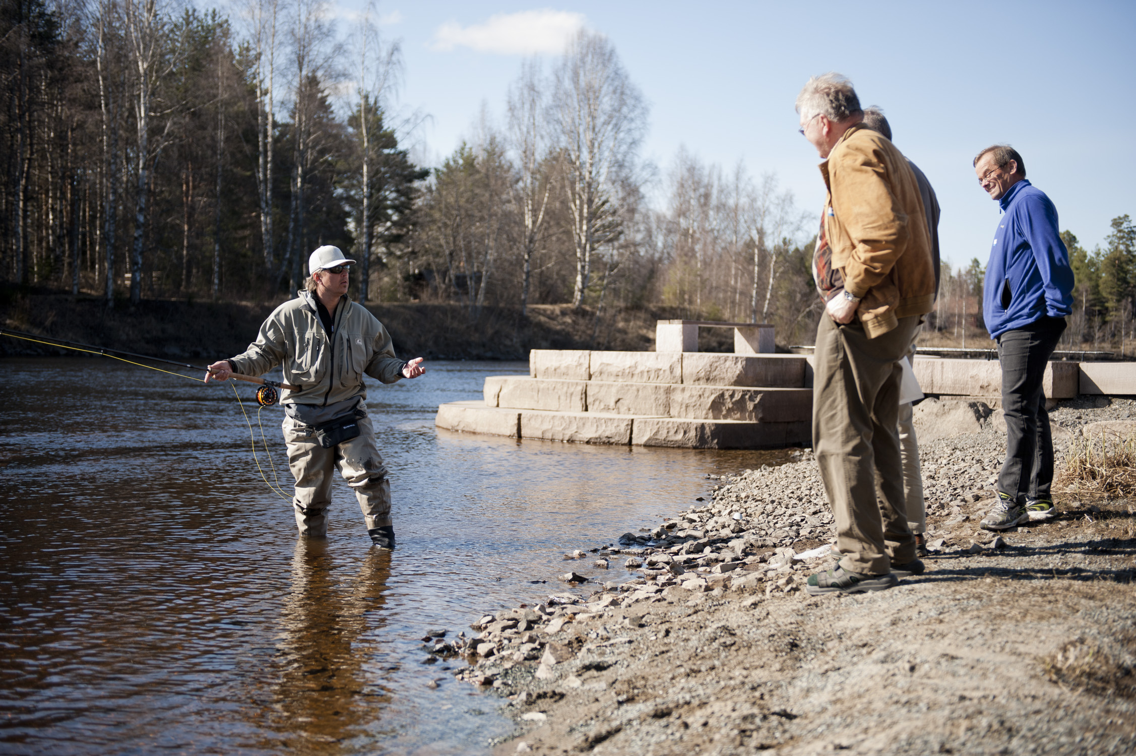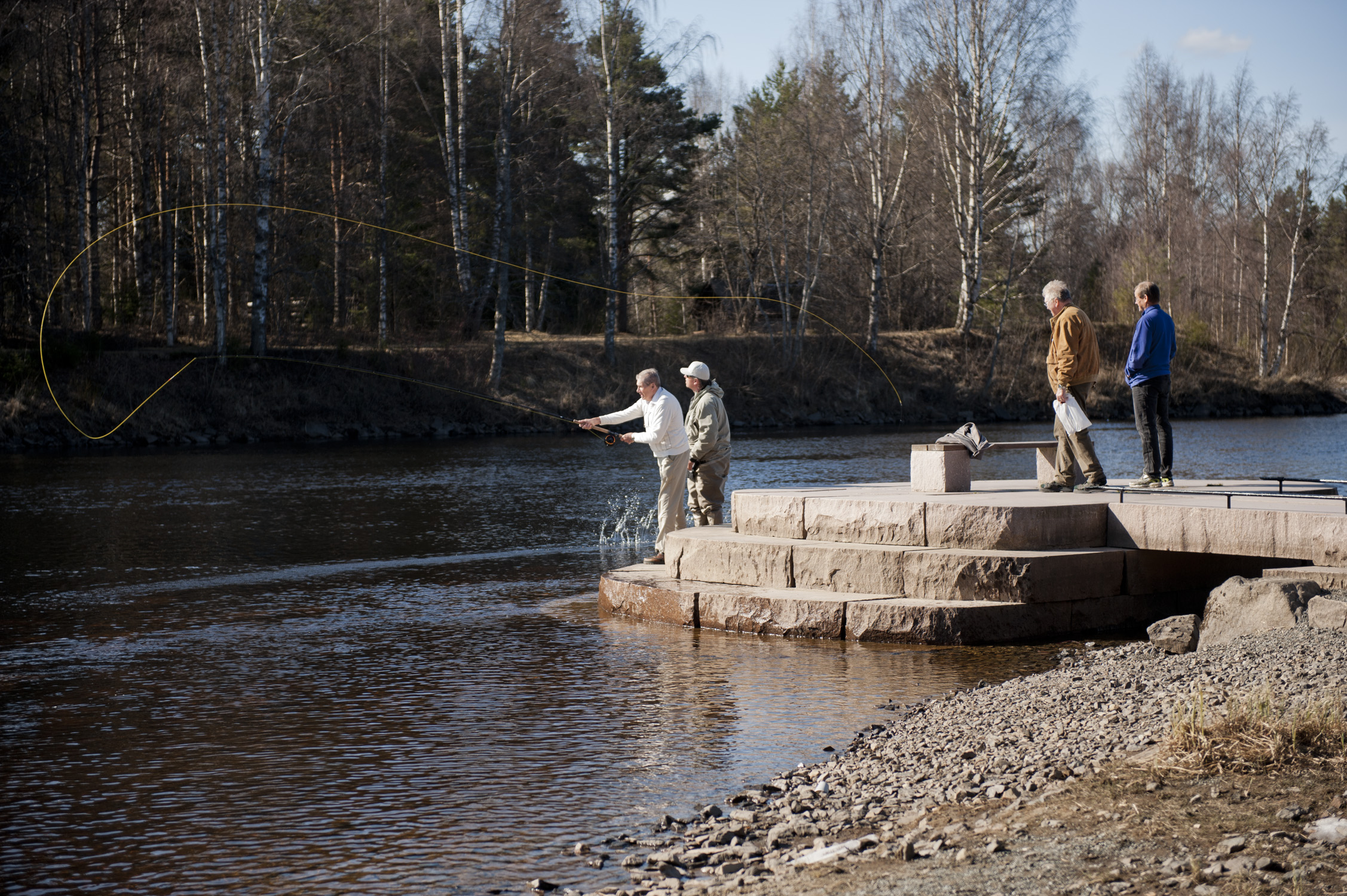 Ved fluesona er vannet mer enn klart nok til at en liten ørrettass avslører seg helt inne ved bredden av en stor gressbakke – et av de få stedene i elva hvor det er mulig å foreta et normalt fluekast over hodet.