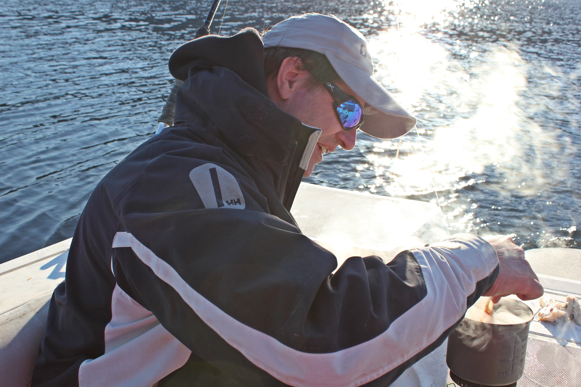 Det så mørkt ut med tanke på å komme seg på sjøen sammen med solen, men da folk begynte å snakke inne i stuen, kviknet resten av NKML-gutta til i tur og orden. Snart var både Calle, Bjørn, Sindre, Sven og faktisk også John-Olav på beina, og det ble konsumert julebrus og eggerøre over en lav sko. Stemningen var strålende, formen var stigende og optimismen var på vei gjennom taket. Gutta var klare for mer!