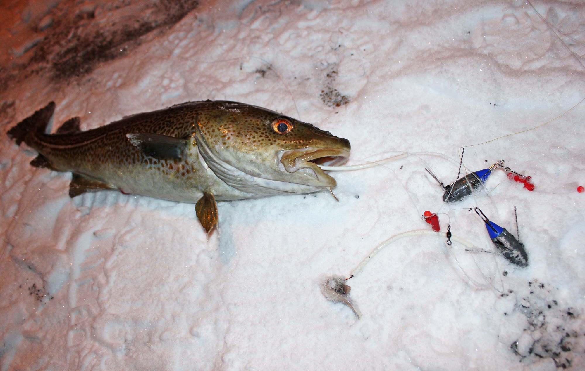 Opp fra den kalde fjorden kom nemlig først topshoten, glidebommen, loddet og krokfortommen som hørte til stangen jeg fisket med. Så fulgte fire nye meter med topshot, en ny glidebom med søkke og en krokfortom med en torsk i enden. Torsken ble for øvrig håvet uten problemer, og vel oppe på land kunne hele situasjonen prosesseres skikkelig. Og her var det mye tilfeldigheter inne i bildet, altså.